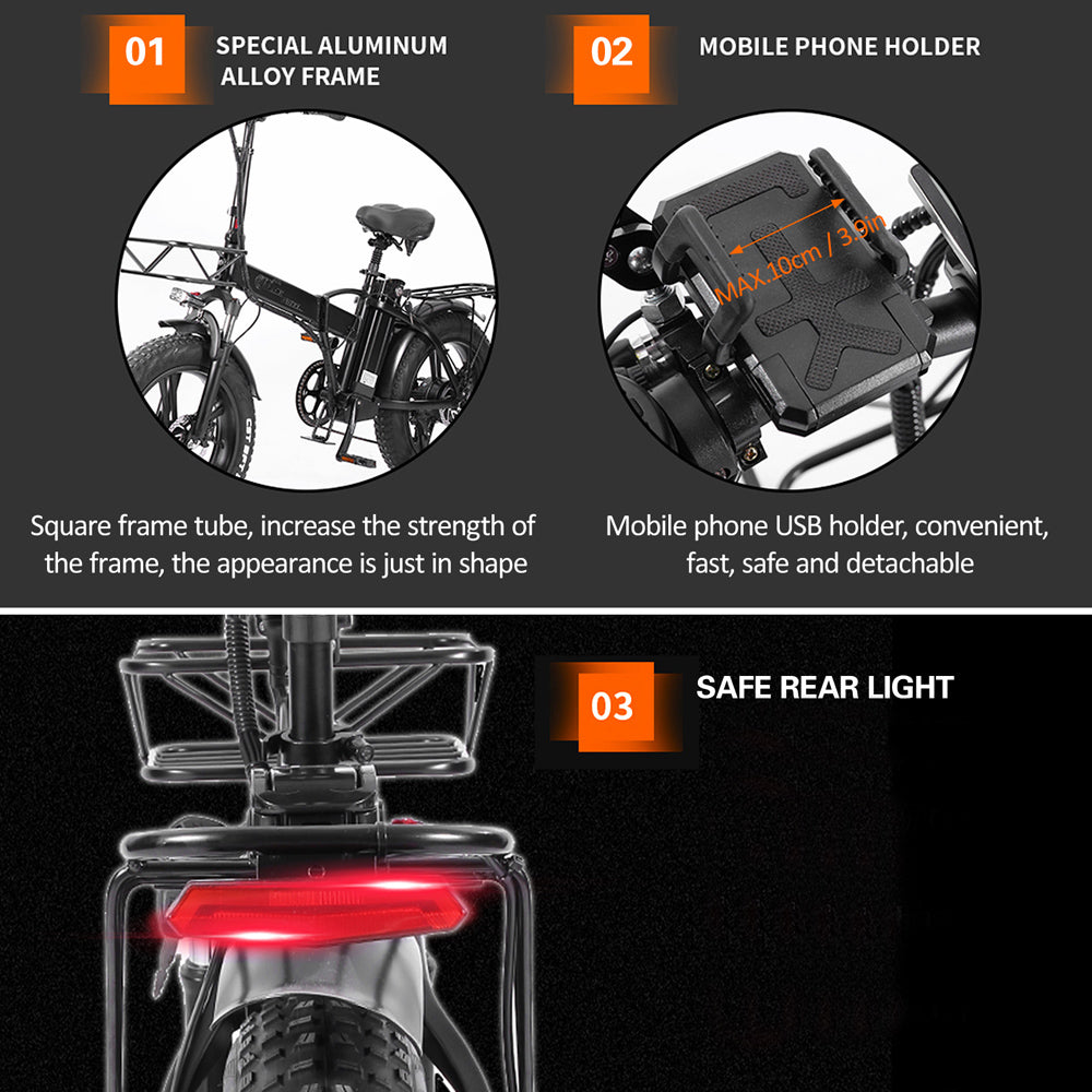 Configuration: The Aluminum Alloy frame is light and strong, and the safe load of this bike is up to 100kg. Front and rear disc brake system effectively reduce the braking distance. 20*4.0 inch fat tires make cycling more stable to suit all road conditions such as snow, road, beach and mountain road.